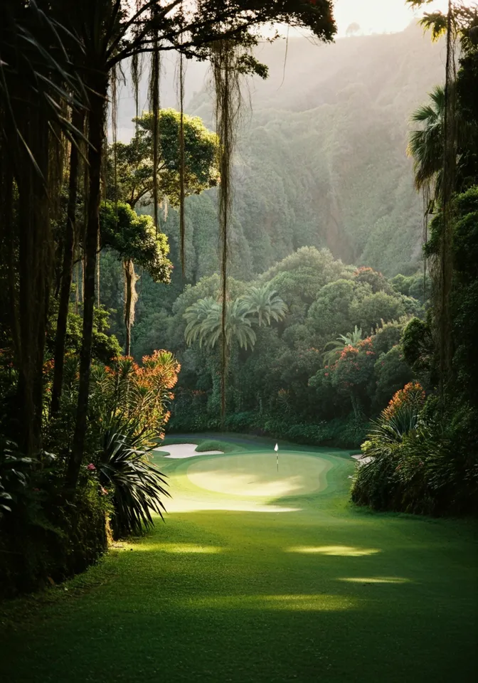A breathtaking nature photography shot of a golf course green nestled within the lush, jungle-like landscapes of Madeira. The vibrant flora surrounds the scene, featuring Estrelícia, Proteas, Anthurios, Aloes, and Hortências in full bloom. Mist gently rolls through the dense vegetation, adding a dreamy and ethereal quality. Sunlight filters through the tropical canopy, casting dappled light on the manicured grass. The contrast between the wild, untamed nature and the pristine golf green creates a striking and harmonious composition. Shot with a high-end DSLR, crisp details, and a rich, natural color palette.