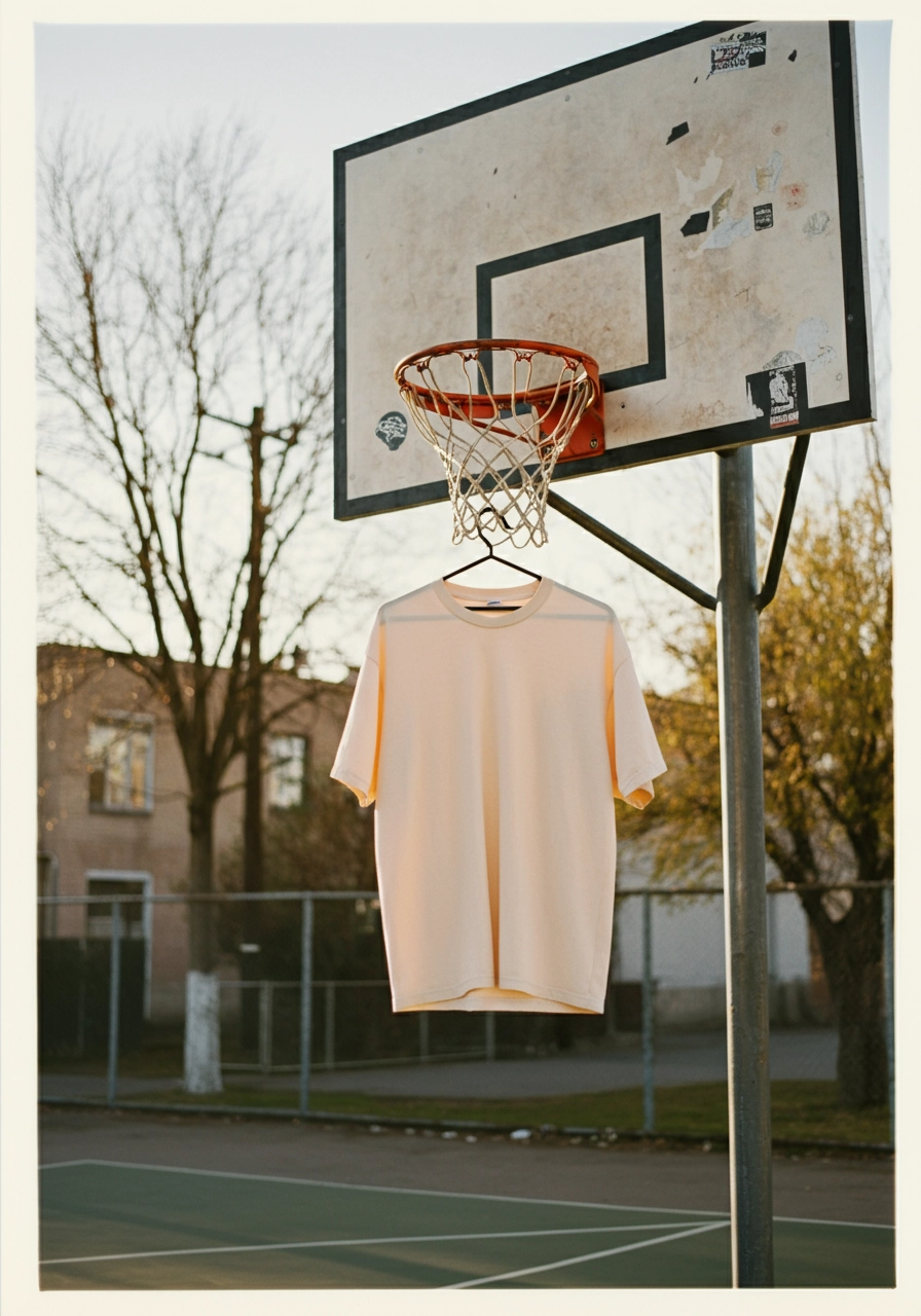 A vintage-style photograph of an urban outdoor basketball court, shot during golden hour on a sunny afternoon. Hanging from the hoop by a black hanger is an oversized, plain off-white T-shirt with no prints or logos, gently swaying in the breeze. The backboard is aged, slightly worn with scratches and stickers, giving it a raw, authentic street vibe. The court is surrounded by a cityscape with parked cars, utility poles, and trees with sparse leaves in the background. The lighting is warm and nostalgic, casting soft shadows. The framing has a slight vignette and analog photo border, evoking a film camera aesthetic. Keywords: basketball court, urban fashion, oversized t-shirt, no logo, vintage photo, streetwear, golden hour, film camera look, Sony Cyber-shot vibe, analog style, sunny afternoon, raw textures, nostalgic frame.