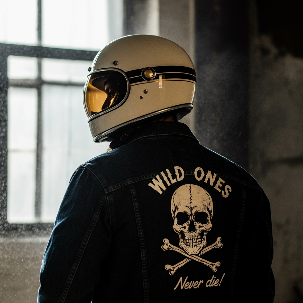 A lone figure stands in soft, atmospheric light with particles floating in the air, creating a dreamy, cinematic effect. They wear a white retro-style helmet with a gold-tinted visor and subtle gold stripe detailing, capturing a mix of vintage and rebellious energy. Their dark denim jacket, visible from the back, features a bold graphic: a stylized skull with crossed bones beneath and the words “WILD ONES” in distressed, bold font above and “Never Die!” below. The overall setting is dimly lit, emphasizing the mystery and grit of the scene, while the figure is partially silhouetted against a bright window, adding a sense of allure and freedom. The vibe is vintage biker rebellion meets modern mystique.