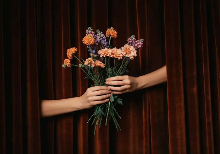 hands coming from behind velvet curtains, minimal aesthetics, bright colors, hard lighting, hands are holding some flowers, minimalist shot