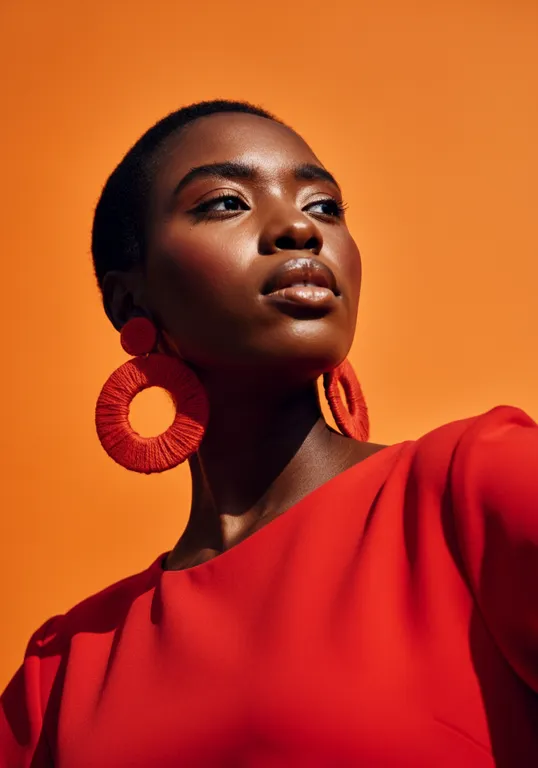 A vibrant editorial fashion portrait of a confident dark black woman wearing a red dress, with oversized circular earrings, set against a bold orange background. Low-angle photography using a Canon EOS R5 and an 85mm f/1.2 prime lens. Soft, diffused artificial lighting highlights skin texture and accessories, creating a smooth and balanced aesthetic. Centralized composition with an intense focus on contrast, bold colors, and minimalism, delivering a striking and modern editorial vibe.