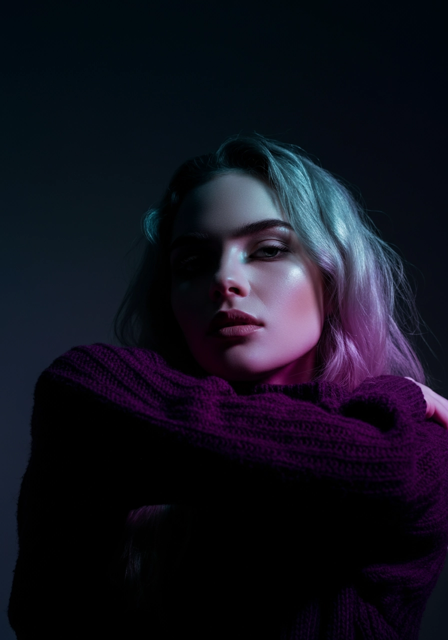 a close up portrait of a female model with a dark background and gradient purple in the front, average looks, being cloned, abstract, experimental, blurry, long exposure, minimal environment