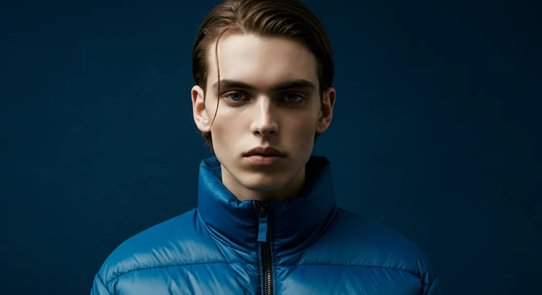 high-end fashion portrait featuring a young white woman model in a studio with a blue backdrop. The model is sharply captured in front face with a defined jawline and a thoughtful expression. He is styled in a puffed blue jacket. The photography is shot using an 8K Canon EOS R5 with a 105mm macro lens, utilizing studio lighting for hard shadow detail and cinematic contrast. The atmosphere is dark, mysterious and energetic, with a subtle film grain and a harmonious palette that blends high fashion with the vibrant spirit.