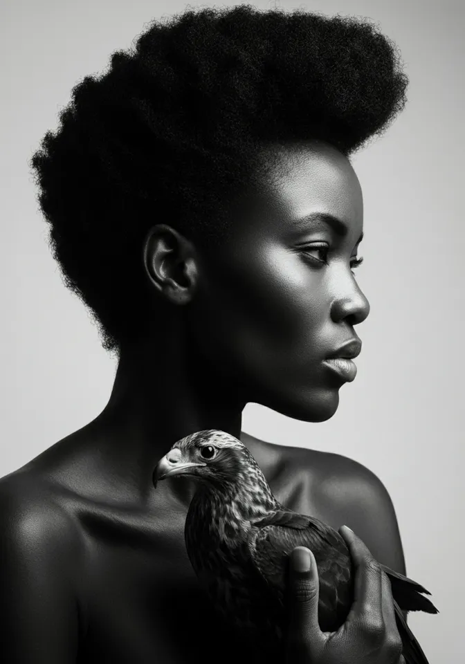a high-quality grayscale portrait of a Black female model with a bird, captured in a close-up. His gaze is directed away from the camera, creating a contemplative and artistic mood. The lighting is soft yet dramatic, highlighting the contours of his face with deep contrasts and smooth shading. The background is minimalistic, ensuring focus remains on his expression and features. The overall composition exudes strength, mystery, and timeless elegance