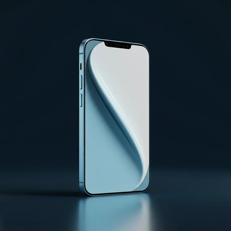 A sleek, minimalist smartphone with rounded edges and a reflective surface, presented at an angle. The phone’s design is modern, emphasizing soft curves and a smooth finish. The color palette is dominated by shades of blue and white, creating a cool, futuristic vibe. The background is plain, accentuating the phone as the central element. The lighting is soft and diffused, highlighting the phone’s glossy texture and subtle color gradients. The composition focuses on the front view from a slight tilt, conveying a clean, elegant mood.