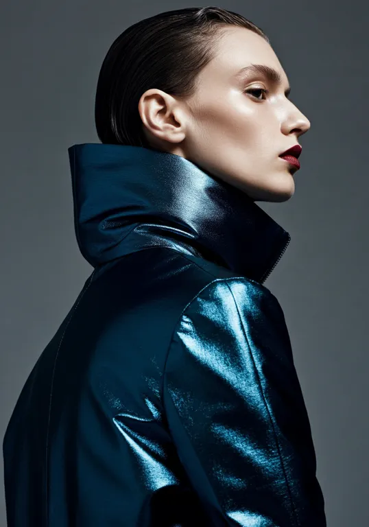 a person is partially turned away, wearing a shiny, dark steel blue jacket with a high collar concealing the lower face. With a bordeau red lipstick. The short, textured hair and the lighting create a sharp contrast with the neutral gray background. The composition is tight, focusing on the upper body from a side angle, emphasizing the sleek, urban, and mysterious mood. The reflective surface of the jacket adds depth and intrigue to the image.