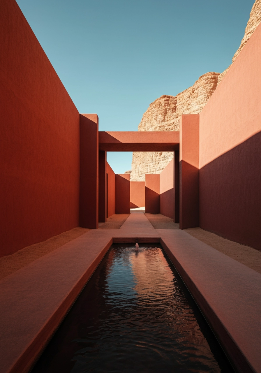 A minimalist architectural landscape set in a vast desert environment, where geometric structures interact harmoniously with the natural surroundings. The composition features bold, monolithic walls in deep red tones, creating a striking contrast against the arid, sunlit terrain and the expansive blue sky. A central water feature reflects the architecture, with an intense, almost surreal red hue that enhances the dreamlike quality of the scene. The visual language is defined by clean lines, stark color contrasts, and an interplay of light and shadow that evokes a sense of tranquility and mystery. The series explores variations in scale, perspective, and arrangement—some compositions focus on long, linear pathways leading into the horizon, while others emphasize enclosed courtyards where light subtly shifts throughout the day. The imagery is deeply inspired by modernist and brutalist architecture, blending raw minimalism with a surreal color palette to create a meditative and otherworldly atmosphere.