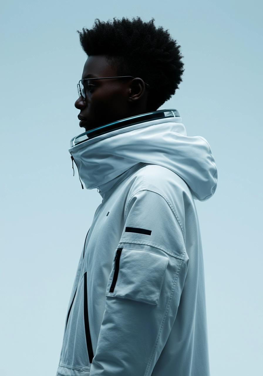 An african is dressed in a astronaut sporty light white jacket and matching hood, featuring a sleek, modern design wearing glasses stands in profile against a soft blue gradient background. Their silhouette is captured sharply, with textured hair adding distinct detail. The lighting creates a contrast between the person’s dark outline and the serene background. The minimalist composition focuses on technology and modernity, conveying a futuristic and contemplative atmosphere. The perspective is side-on, design and the person's thoughtful posture. The individual looks to the side with a calm expression. The light grey background is minimalistic, enhancing the focus on the attire. Soft lighting highlights the glossy texture of the jacket, emphasizing a cold-weather theme. The composition captures a side profile, with a balanced, centered perspective, evoking a sense of cool efficiency and modern style.