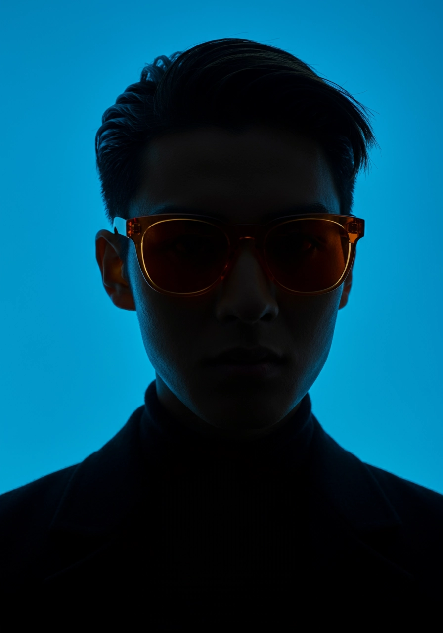 The image presents a striking silhouette of a person against a vibrant blue background. silhouette outline is defined, displaying hair on top, adding texture to the silhouette. The most eye-catching feature is a pair of bright orange translucent glasses that stand out starkly against the person's darkened visage, creating a chic and contemporary look. Minimalistic bold use of colour, and silhouette gives the image a modern, artistic feel, highlighting the contrast between shadow and light.