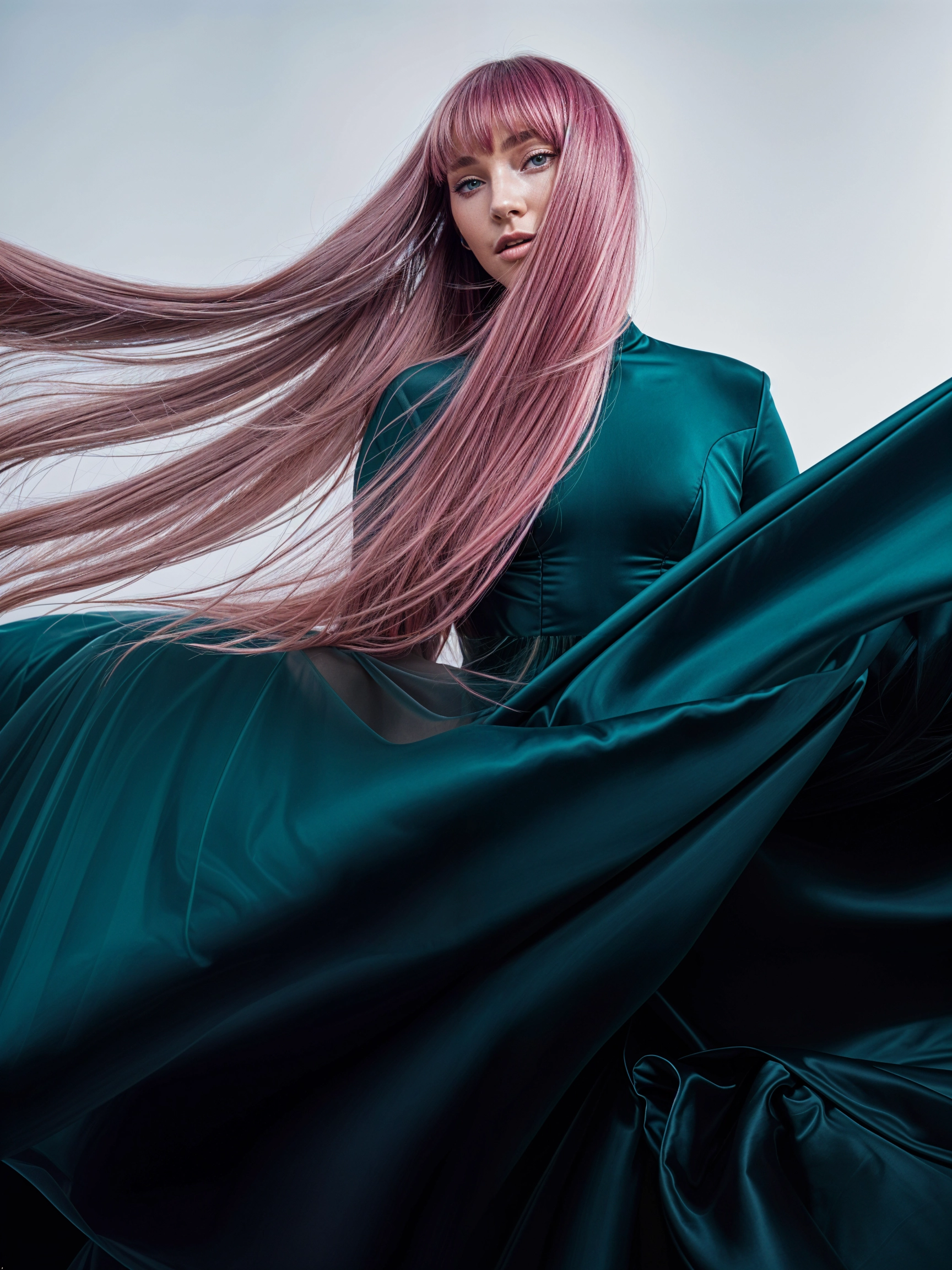 photo real, futuristic clothes, sci-fi outfit, A beautiful woman with long straight hair, smooth and shiny, wearing a futuristic matt finish gown, clothes inspired from sci-fi films, flowing down her back, in an elegant pose on a white background for a highly detailed stock photo. A perfectly symmetrical photo of a gorgeous female model posing in perfect harmony with her hair and body. Her long, smooth hair is elegantly fluttering in the wind, beautifully illuminated by studio lighting in white, white background