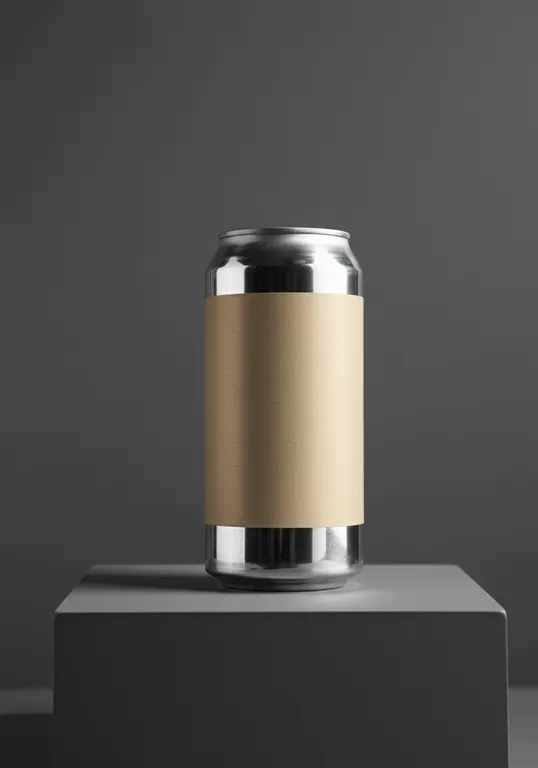 A taller silver aluminum can with a longer beige label stands prominently on a small pedestal. The background and pedestal are in shades of grey, creating a monochromatic theme. Lighting is even, casting soft shadows that highlight the can's reflective surface. The image is centered and closely cropped, focusing on the can, evoking a clean and modern aesthetic with a warm, inviting atmosphere.