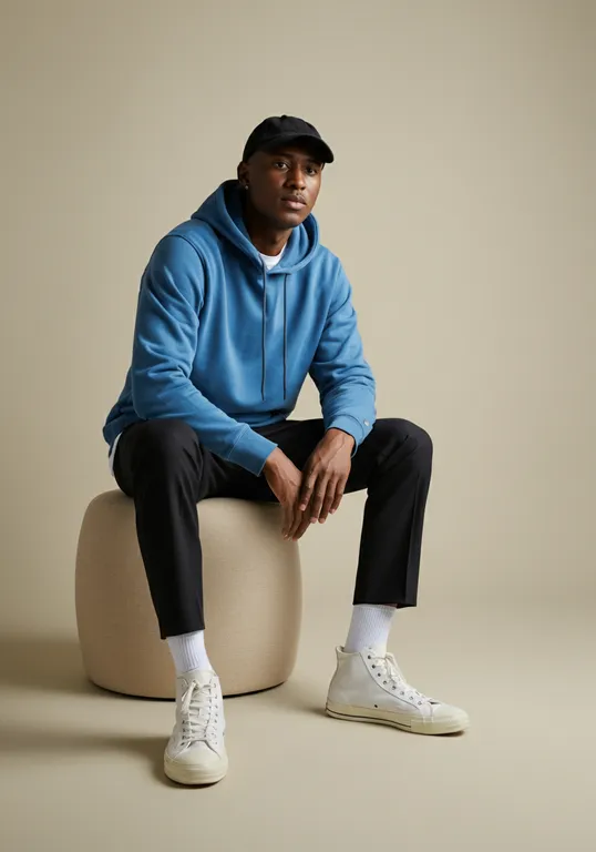 A minimalist and modern portrait of a stylish young man confidently seated on a beige stool, wearing a blue hoodie, black pants, white high-top sneakers, and white socks. He sports a black cap, exuding a relaxed and calm confidence. The scene is set against a cozy, beige background with soft lighting that casts gentle shadows, emphasizing neutral tones. Captured at eye level with a Fujifilm X-T4 and XF 50mm f/2 R WR lens, the composition follows the Rule of Thirds, enhancing the subject's presence with subtle negative space.