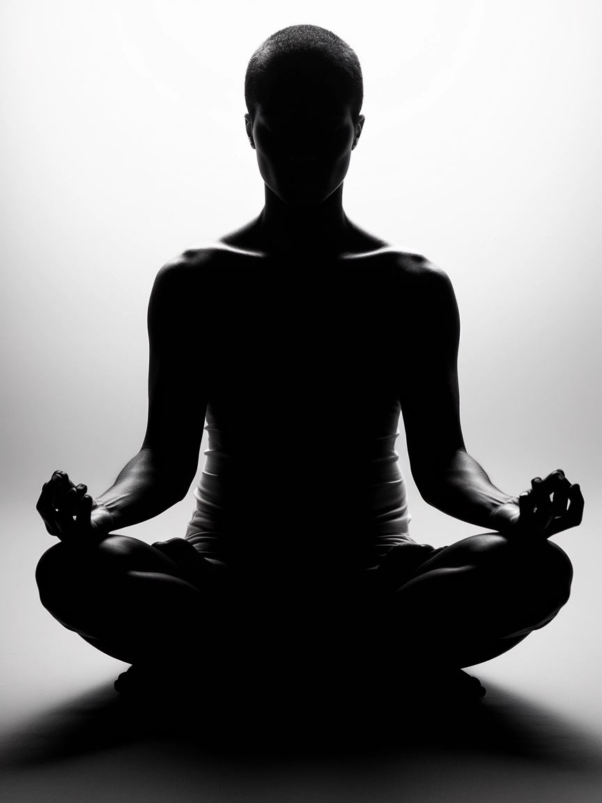 A visually striking and abstract editorial photograph captures a person in a cross-legged meditation pose, often referred to as ‘sitting Indian style,’ embodying tranquility and introspection. The composition highlights the seated figure from the torso upwards, with the upper body gradually dissolving into deep, dark gradients that obscure the head and shoulders, creating a dramatic and mysterious effect. Subtle, intentional lighting accentuates the natural contours of the hands resting gently on the knees and the folds of the clothing, while the face and upper torso remain shrouded in shadow to enhance the enigmatic mood. The background seamlessly blends with the dark tones, reinforcing a modern, minimalist aesthetic. The overall style exudes sophistication, inviting viewers to interpret the serene and contemplative energy of the scene while maintaining an air of elegant mystery. White background