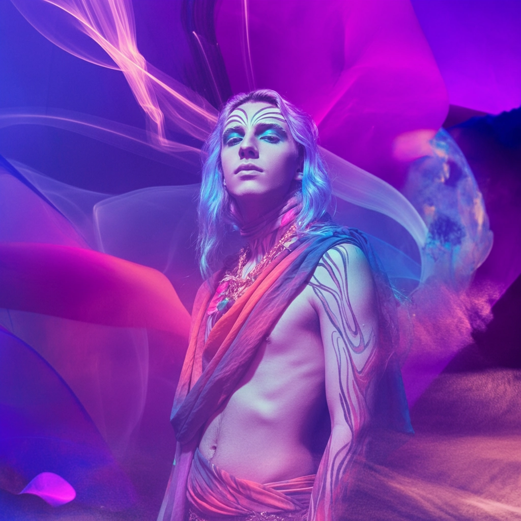 Create a surreal portrait of a person standing in a misty landscape filled with ethereal colors, such as soft purples and blues. The subject should have an enigmatic expression, wearing a flowing outfit that blends into the surroundings, with subtle glowing elements. The background features dreamy, abstract shapes and wisps of light, creating a captivating and otherworldly atmosphere.