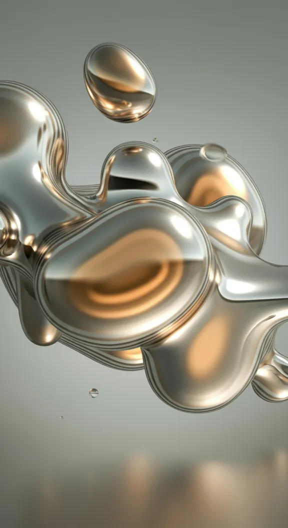 Abstract image depicting a collection of smooth, reflective metallic forms with more pronounced liquid-like surfaces. The objects display a blend of silver and gold hues, highlighting their enhanced fluidity and more organic shapes. The background is a soft gradient of light grey, emphasizing the glossy textures and vivid reflections. The composition features a close-up perspective with a seamless arrangement, creating a futuristic and elegant atmosphere. The lighting accentuates the metallic sheen and the intricate reflections, contributing to the image's dynamic and modern mood.