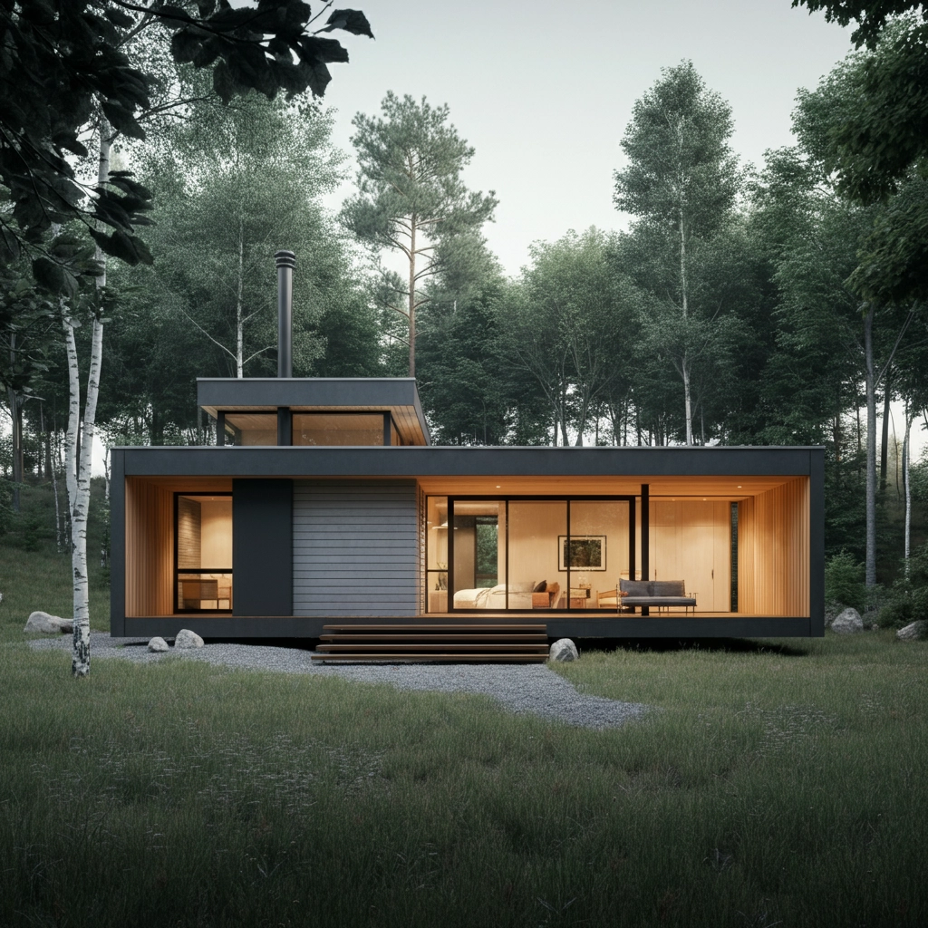 Minimalist modern cabin with a flat, rectangular shape, surrounded by woods and open grassy fields