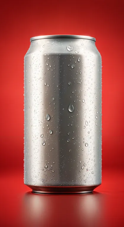 Create a hyper-realistic close-up image of a 473ml can with a plain white label as the main subject, centered in the foreground. The can appears cold and refreshing, with condensation droplets glistening and some water droplets sliding down the surface, emphasizing its chilled state. The background is a vibrant, uniform red, slightly blurred to ensure the focus remains on the can. The lighting is soft yet highlights the metallic texture and cold appearance of the can, casting subtle reflections on the droplets to enhance the sensation of freshness. The overall composition conveys an inviting and crisp aesthetic.
