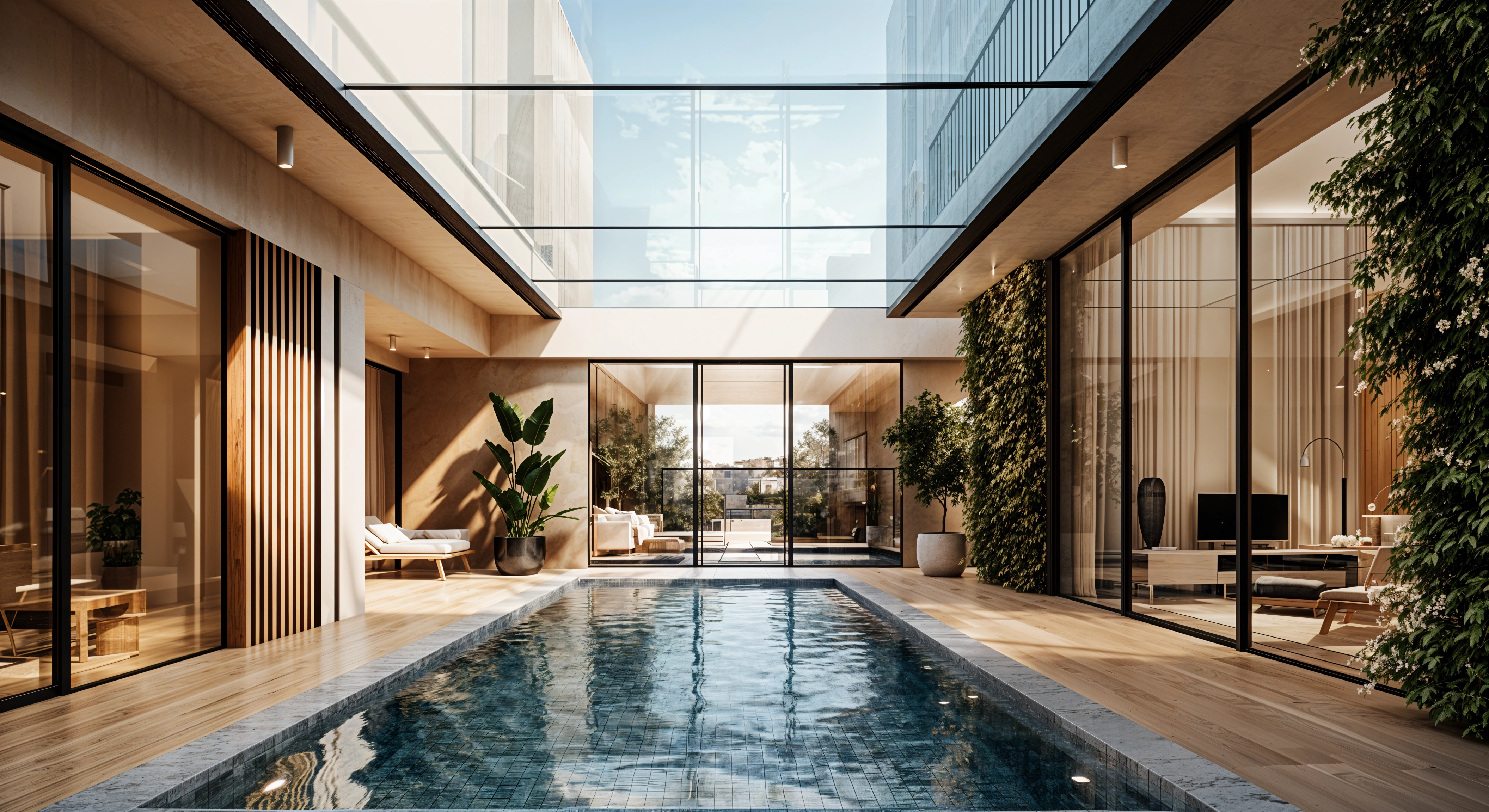 A realistic photo of a contemporary residential rooftop terrace featuring a central pool, surrounded by elegant glass walls, wooden details, and stone textures. The scene captures the terrace's minimalistic and sophisticated design, with a glass ceiling allowing natural light to flood in. Wide-angle shot at eye level showcases an ample floor area for post-editing elements, with balanced natural daylight emphasizing warm tones on wood and stone. The composition uses leading lines and symmetry to create depth and focus, with soft reflections on the glass and water, exuding modern architectural elegance.