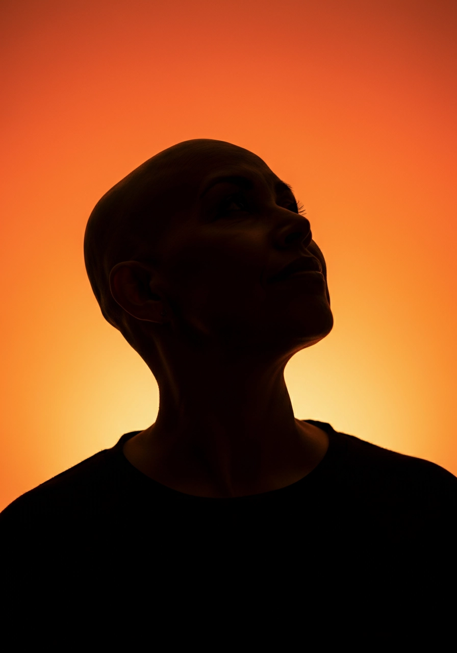 A silhouette of a bald person in profile, gazing upward with a calm and introspective expression. The individual is set against a vibrant orange gradient background, creating a striking contrast. The lighting emphasizes the contours of the silhouette, capturing the essence of tranquility and contemplation. The composition is centered, with a focus on the smooth transition of colors in the backdrop, enhancing the serene and thoughtful atmosphere. The lighting is positioned behind or to the side of the subject, creating a stark contrast that accentuates the contours of the profile and gives a three-dimensional effect to the image.