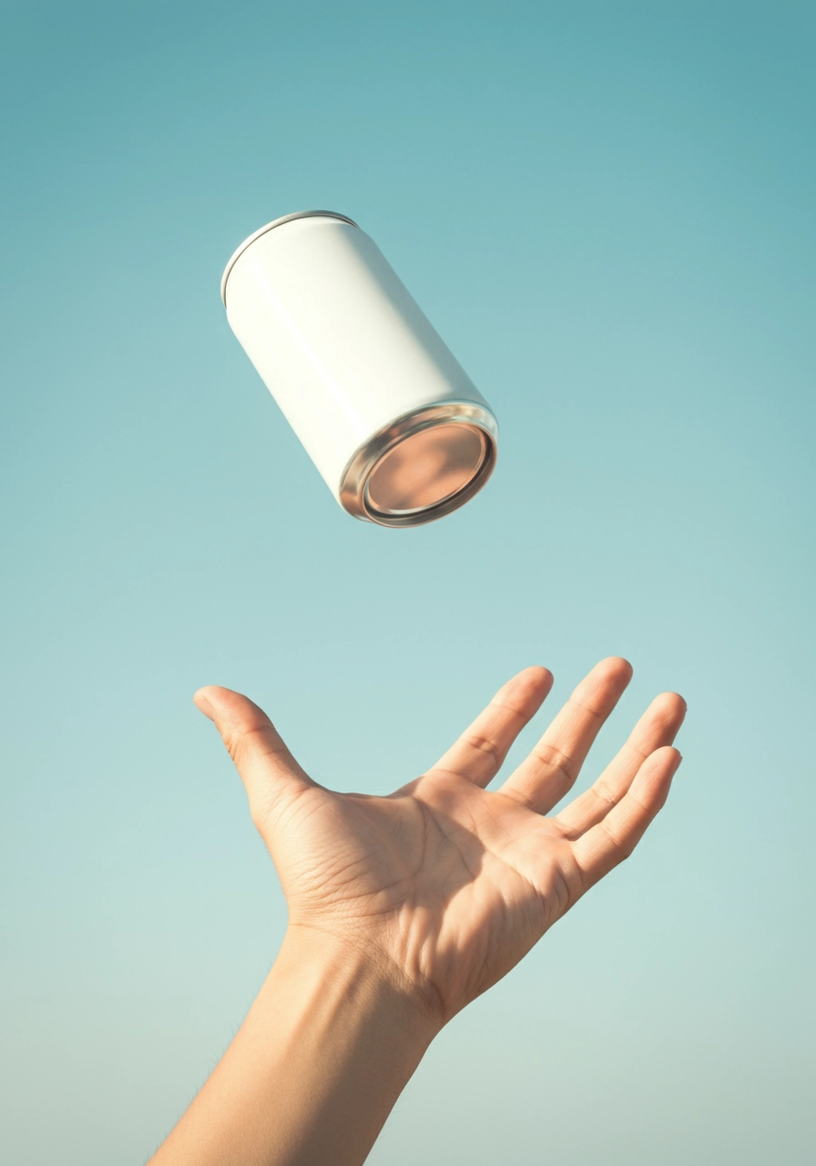 Photo of a white soda can with no labels, being tossed up against a light blue sky. A hand is ready to catch it, with realistic shadows and a vintage look.