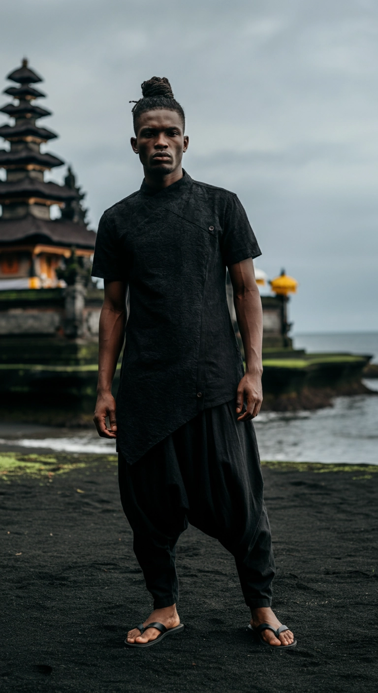A dark-skinned model against the backdrop of temples on the island of Bali, dressed in men's clothing with Japanese motifs. He is wearing a black shirt made of natural fabrics with a textured pattern, an asymmetric cut, and loose hakama pants that emphasize a unique style. The atmosphere is calm, with a light sea breeze flowing through the clothes." "A dark-skinned model on a background of picturesque beaches of Bali, dressed in men's clothing with Japanese motifs. He is wearing a shirt made of natural fabrics with an asymmetric cut and unusual trousers that emphasize a unique style. The atmosphere is calm, with a light sea breeze gently flowing through the clothes."