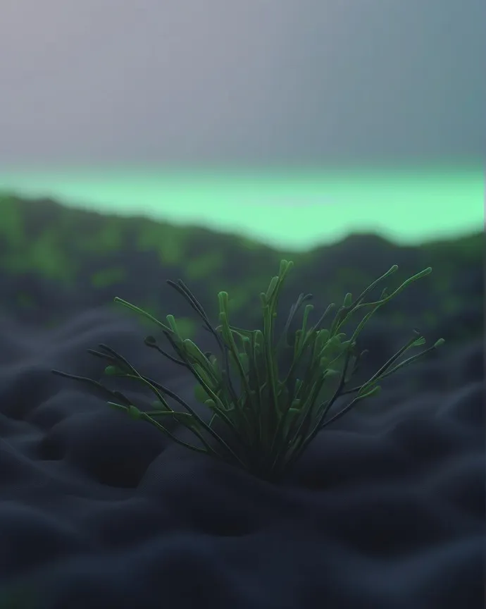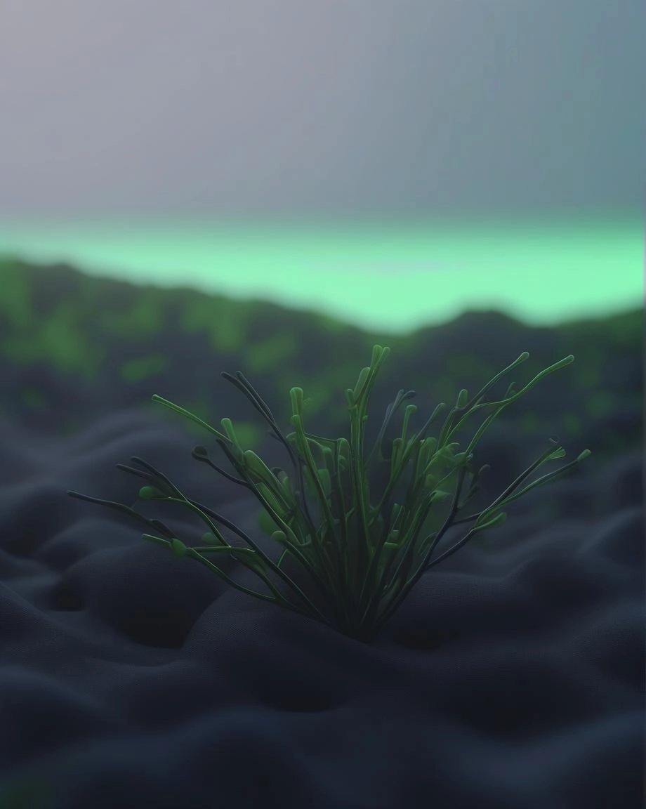 desolate landscape with no life has a plant that looks like a computer chip breaching the surface in a beautiful way pulsing data into the air