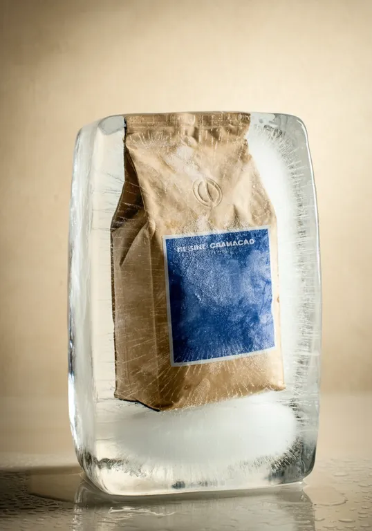 a zoomed-out view of a widened film-y looking photo of a bag of coffee frozen in a block of ice, emphasizing the expansive icy surface. the ice block is on a creamy, tan seamless backdrop with dramatic lighting. the ice block is not melting, but has sharp ice corners and rough texture. the coffee bag on the inside is a tan bag with a bright blue label, and has a frosted coating.