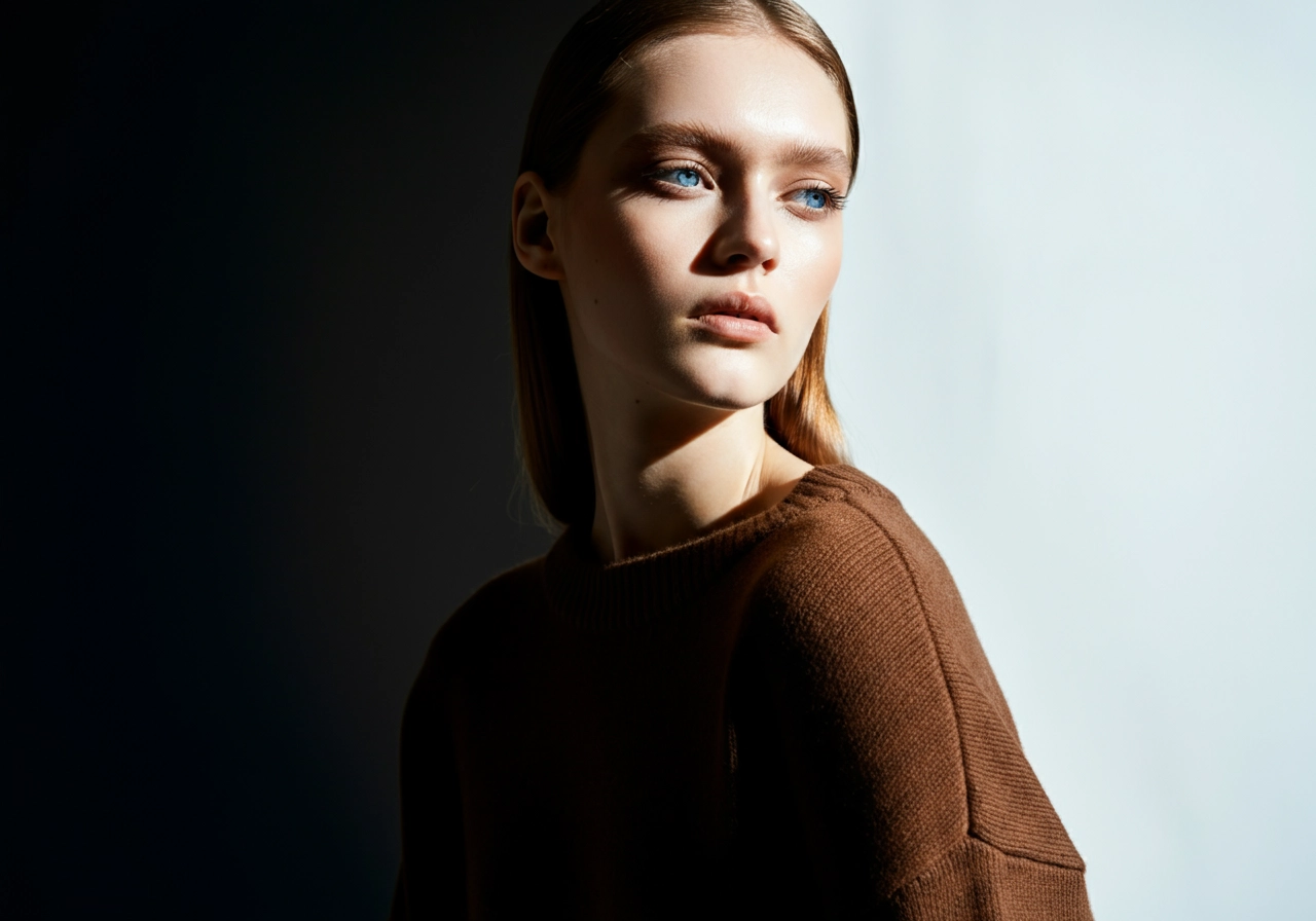 A high-end fashion portrait featuring a young woman model with blue eyes in a studio, against a white background. The model is sharply captured in full height with a thoughtful expression. She is wearing a luxury brown sweater. The photography is shot using an 8K Canon EOS R5 with a 24mm lens, utilizing studio lighting for soft shadow detail and cinematic contrast. The atmosphere is sophisticated and minimal.