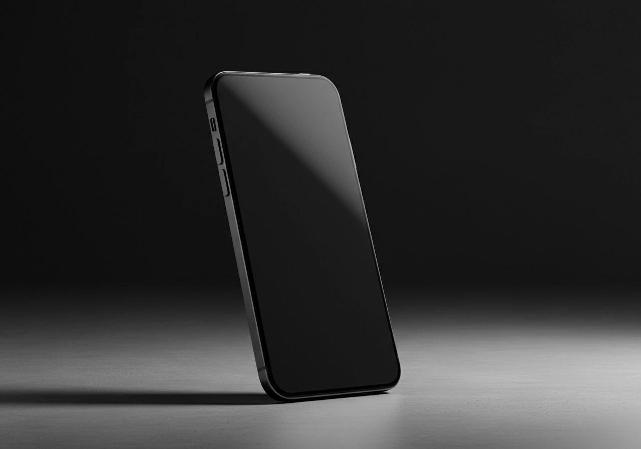 A smartphone stands propped up against a textured concrete surface, displaying a sleek mockup screen with a black display. The scene is lit with soft, angled light that casts shadows, creating a modern, minimalist setting. A neutral color palette enhances the sophisticated atmosphere. The perspective is slightly angled, accentuating the design of the device and the play of light on the surfaces, evoking a professional, tech-focused mood.