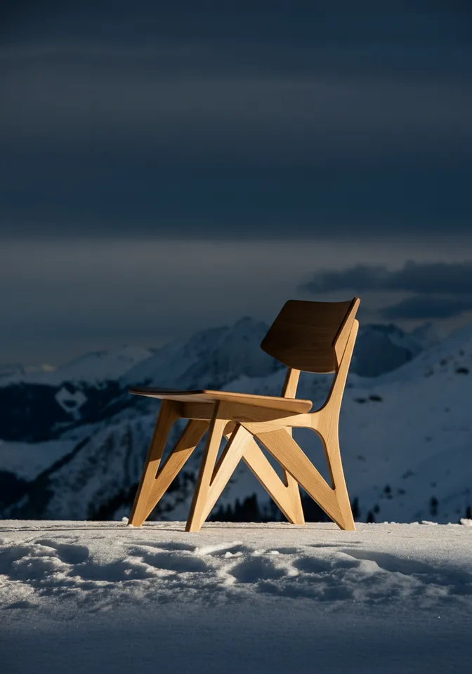 upscale modern Scandinavian avant-garde furniture made of oak wood in a winter mountainscape