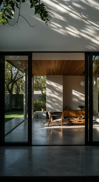 A better minimalist, modern living room in a luxurious house, viewed from outside to the inside the house. We see the large floor-to-ceiling glass sliding door. We see a polished concrete floor in a warm interior with wooden elements and accessories, contemporary furnishings rest against clean, off-white walls softly illuminated by natural daylight. Shadows from nearby trees subtly pattern the walls, enhancing the serene ambiance. The light is bright yet gentle, suggesting late afternoon. The overall composition captures a harmonious blend of nature and sophisticated architecture, evoking a tranquil and inviting mood.