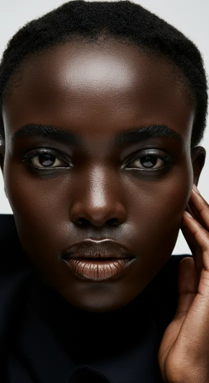 Front facing Close-up portrait photography of the atypical African high fashion model, avant-garde dynamic photography, different close-ups, high resolution, hyperrealistic hyperdetailed skin texture, and facial features, a model with unconventional beauty, motion in blurr, high cheekbones, crooked nose,wide-set eyes, asymmetrical features, sharp jawline,mert&marcus, fine details, dazed and confused magazine, iconic imagery, mid-action,32k, DSLR, UHD, Photograph by Nick Knight soft tones, stunning modern avant-garde and minimalist brand visuals.modern avant-garde art direction, minimalism, different perspectives, earth tones, creative saint laurent editorial, motion in blurr, avant-garde gold minimalist jewelry, vibrant make-up made by Path McGrath, models from various ethnicities, dynamic dramatic poses, white background