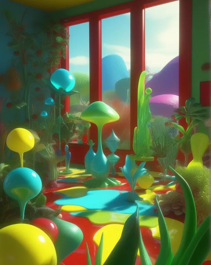 Alien landscape with blown glass and toys and plastic plants. Models wearing weird fashion. Yellow, blue and green and red and ruby. Surreal painting. Style of de Kooning and 60s art.