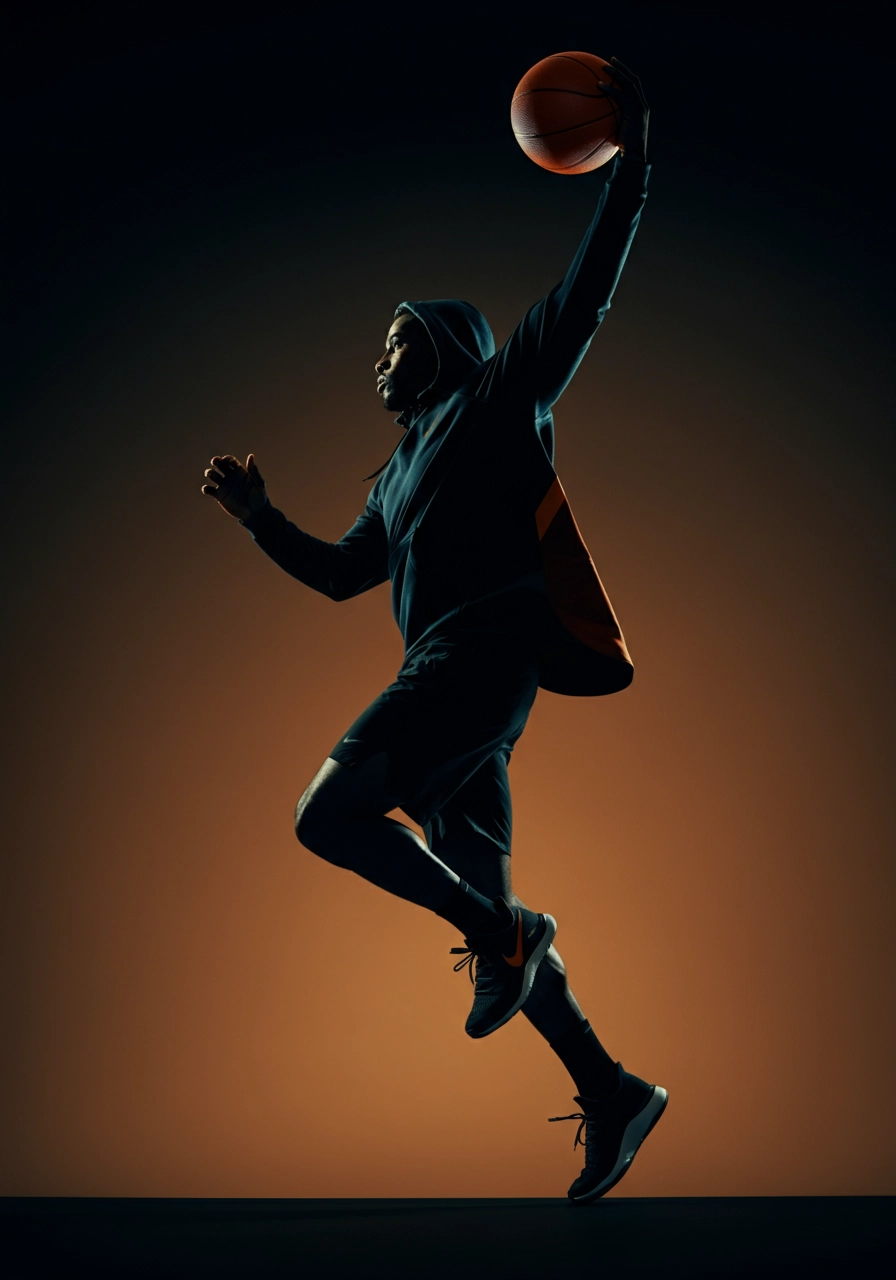 Contemporary 2025 Nike running style-ad, like something designed by Mouthwash Studio or Porto Rocha. A silhouette of a man shooting a basketball against a slightly darker sunset-esque gradient background with colors #f27221 and #232323. He is wearing athletic attire, including a hoodie and running shoes. The image captures a dynamic side profile, emphasized by the sharp contrast between the dark silhouette and the gradient background. The lighting casts a dramatic effect, highlighting the subject’s athletic form and motion. The overall composition exudes energy and movement, with a sporty and intense atmosphere.