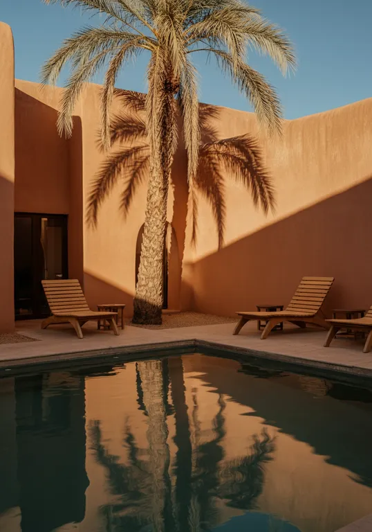 A serene courtyard of semi underground dwellings featuring a minimalist design with a terracotta-colored wall and a tall palm tree casting its shadow. The scene includes several modern wooden lounge chairs , positioned around a calm, rectangular pool. The setting conveys a warm, desert-like ambiance with subdued lighting during the golden hour, enhancing the earthy tones and creating a tranquil, peaceful atmosphere. The perspective captures an intimate corner angle, focusing on the interplay of shadows and reflections on the water, evoking a sense of relaxation and solitude.