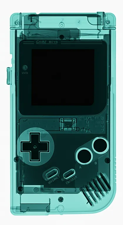 A classic Game Boy. The image reveals the internal components, including the cartridge slot, circuit board, battery compartment, and D-pad mechanism. The D-pad is labeled with specific icons: a cross-shaped directional pad with an up arrow at the top, a down arrow at the bottom, a right arrow on the right, and a left arrow on the left. The A and B buttons are labeled as circles with ‘A’ and ‘B’ inside them. Labels and text are visible, showcasing the intricate design and technology behind this iconic handheld gaming device.