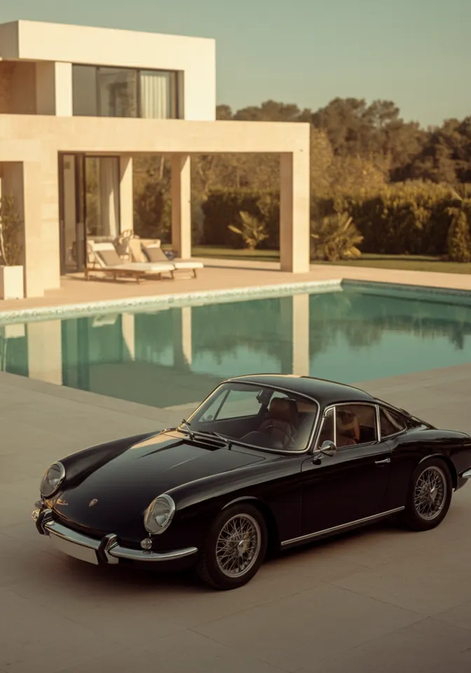 black porshe in professional shooting for advertising, with retouch and color grading. Car parked in a luxury house, besides a big pool. Warm color grading, Sunlight casts warm tones across the scene, creating a cheerful and inviting atmosphere.