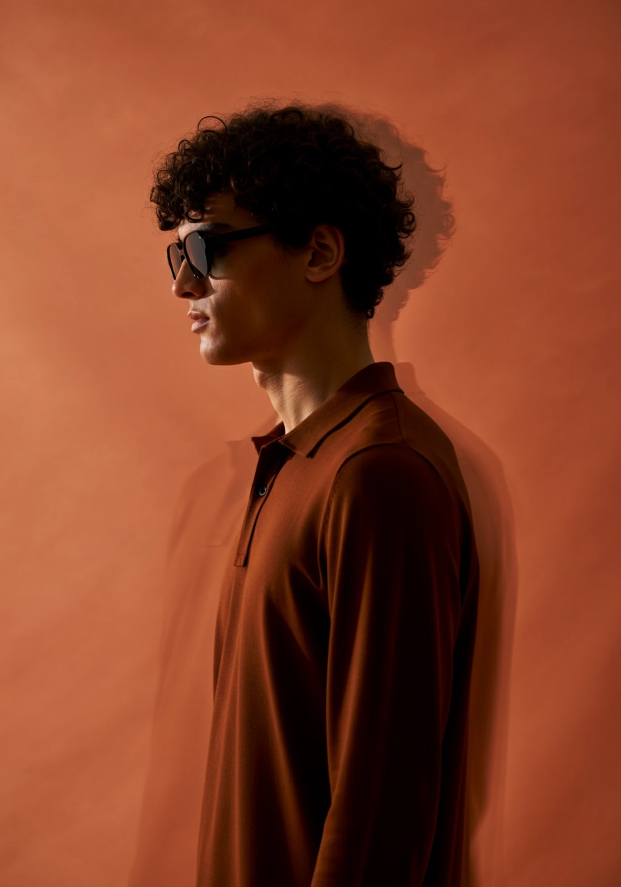 A blurred silhouette of a man with curly short hair standing against a soft, terracotta background. The figure is side-facing, suggesting a sense of movement and motion blur. He is wearing sunglasses and long-sleeve polo shirt. The lighting is even and soft, creating a dreamy, ethereal atmosphere. The composition is minimalist, with the subject slightly off-center, emphasizing the simplicity and contemplative mood of the scene.