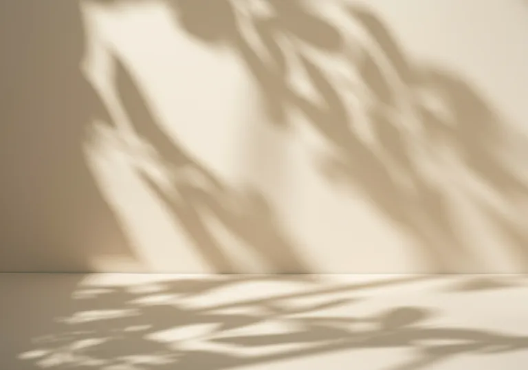 A minimalistic scene featuring soft shadows of leaves cast on a light beige wall, evoking a serene and calm atmosphere. The shadows suggest the presence of nearby foliage, creating a natural, organic feel. The lighting is gentle and diffuse, enhancing the subtle warm tones of the background. The composition is simple, focusing on the interplay of light and shadow with no distinct focal point, allowing for a tranquil and understated mood.