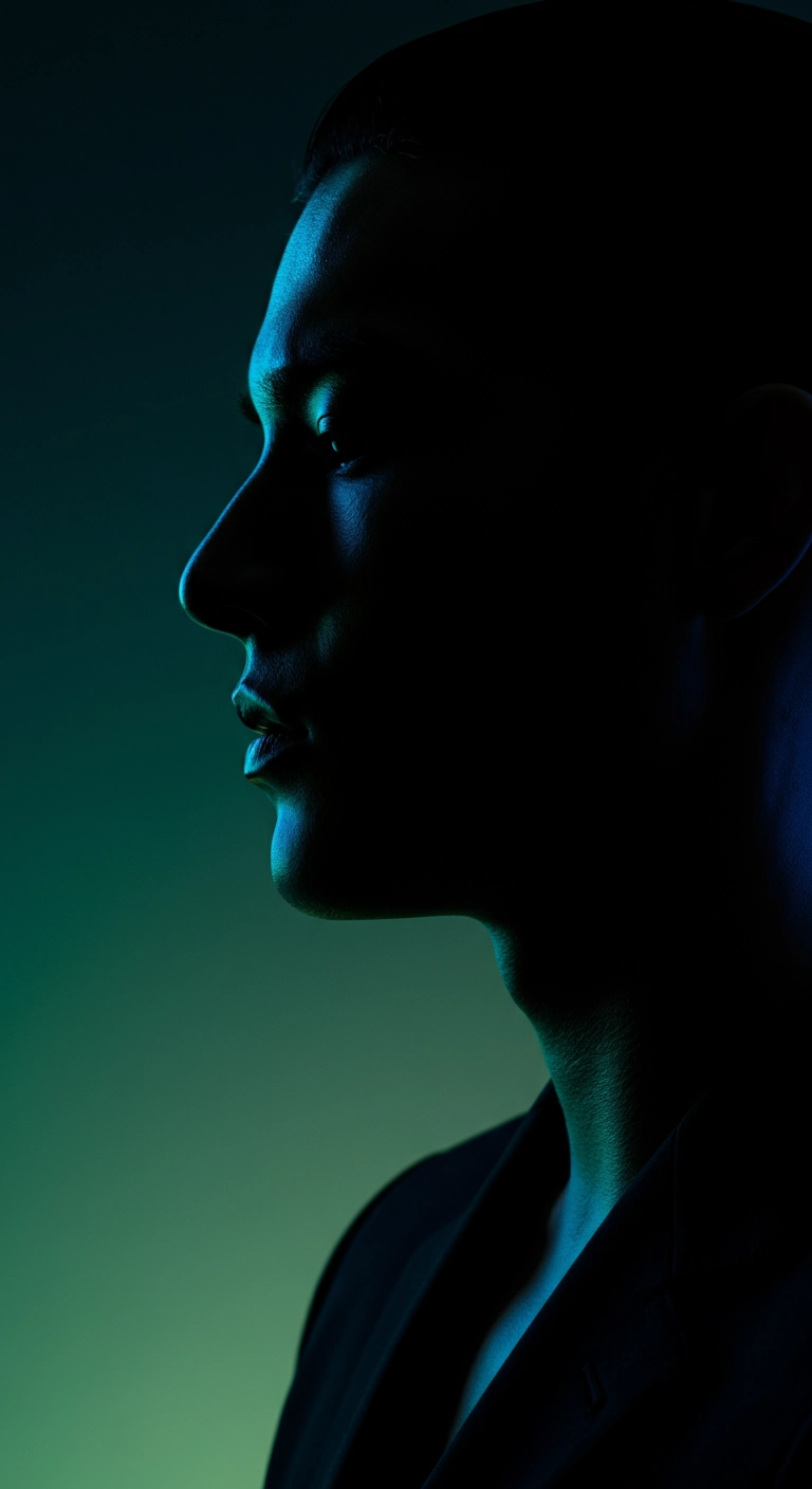 A profile portrait of a person with a slightly forward-leaning posture, elegant and sophisticated. The image highlights the face, neck, and part of the shoulder, framed in a soft green-blue backlight that creates a rim light effect, accentuating the silhouette against a dark, gradient background. The face is partially shadowed, with a subtle diffused frontal light creating a dramatic contrast. The colors emphasize a futuristic aesthetic with dominant green-blue tones and dark shadows. The skin appears smooth and slightly translucent, with an intentional blur for a mysterious and ethereal effect. Shot using a Canon EOS R5 camera with a 50mm f
