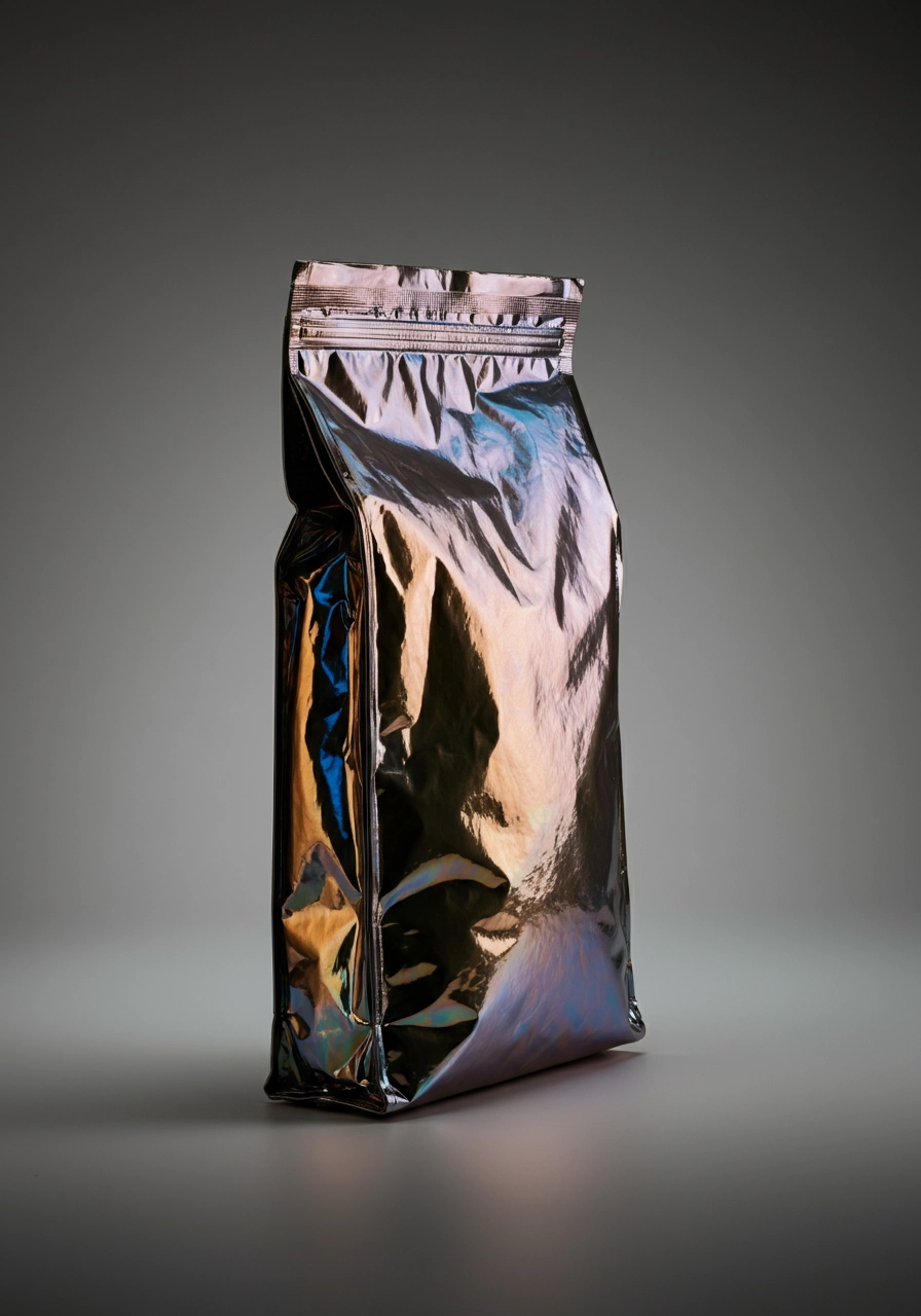 A rectangle metallic bag stands upright against a gradient from soft dark to white grey background, its crinkled surface reflecting various abstract colors. The bag has a sleek, reflective finish. The lighting highlights the shiny, textured surface, creating a modern and minimalist atmosphere. The composition is straightforward, with a focus on the bag from a slightly angled side perspective, emphasizing its glossy, industrial aesthetic.