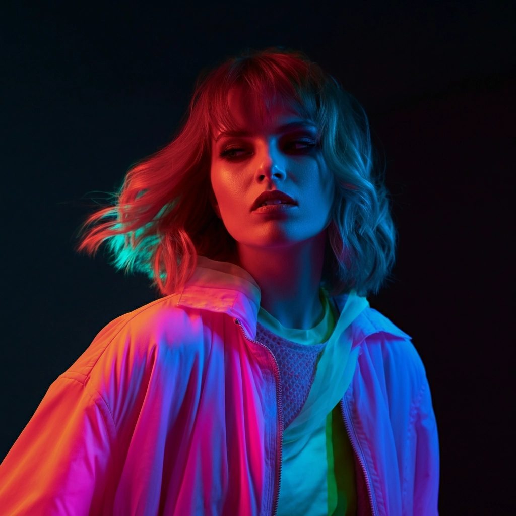Woman in brightly colored clothing, captured in motion with a glitch effect and neon lighting