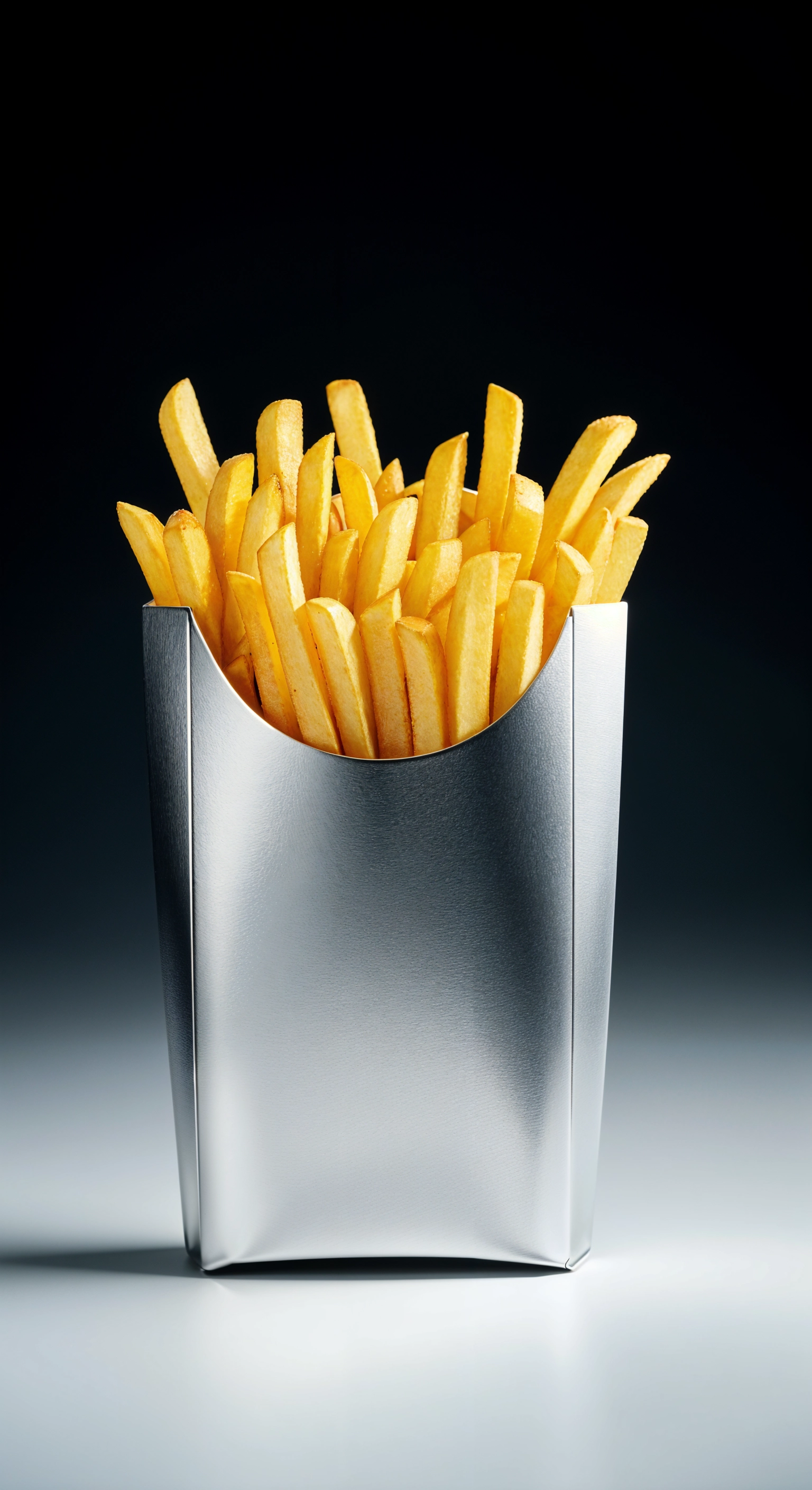 A close-up front shot of a metallic pack of French fries is placed in the middle of view. The package has no text or labels. Linear gradient from really dark blue to white from top to bottom. the bottom half of the image is white, the top half of the background is black