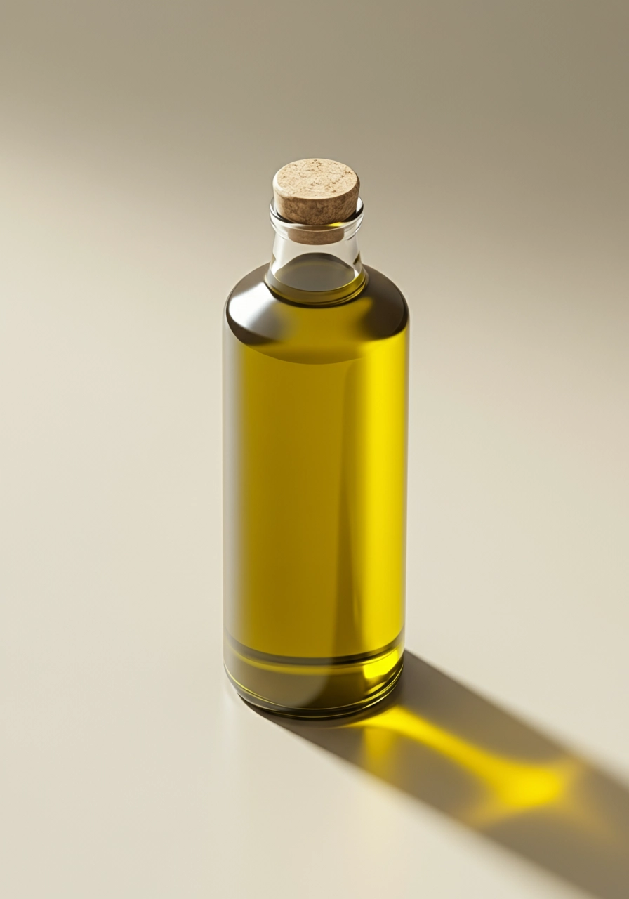 A modern full olive oil bottle, isolated in isometric perspective, viewed from above in isometric perspective