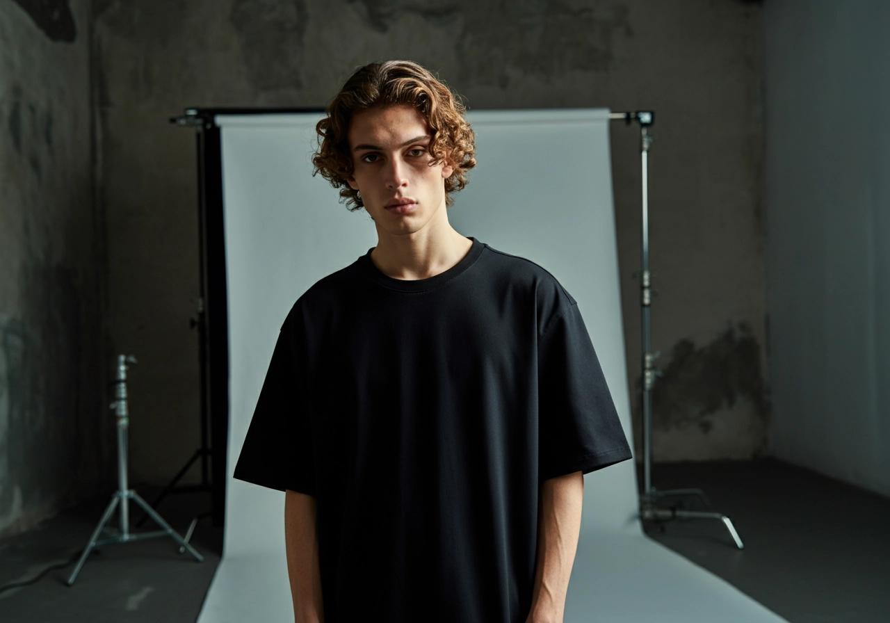 A young male model wearing an oversized black T-shirt, standing in a studio with parts of the background visible, illuminated by soft natural window light. The focus is on the T-shirt, captured at eye level using a Canon EOS 5D Mark IV with a Prime Lens. The shot uses the Rule of Thirds to balance the subject and background, with a minimalist style