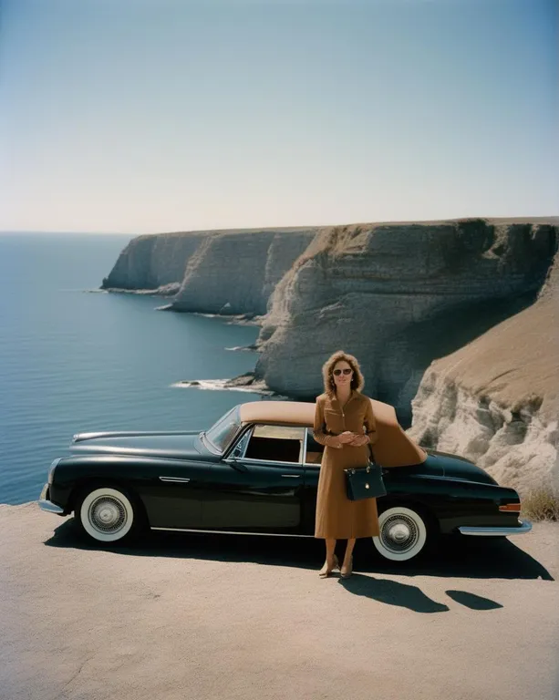 a woman wearing sunglasses and a leather purse standing next to a luxury vintage car along a seaside cliff