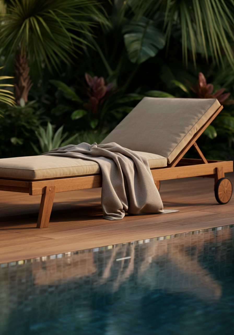 Realistic close-up of a tropical outdoor scene featuring a wooden lounge chair with beige cushions and a soft blanket draped casually, set beside a shimmering pool. Captured with a Canon EOS 5D Mark IV and a prime 85mm lens for sharp focus on the chair and subtle bokeh in the background, surrounded by lush tropical vegetation with palm leaves framing the shot. Soft natural lighting during late afternoon adds warmth and creates gentle shadows for a serene, inviting atmosphere.