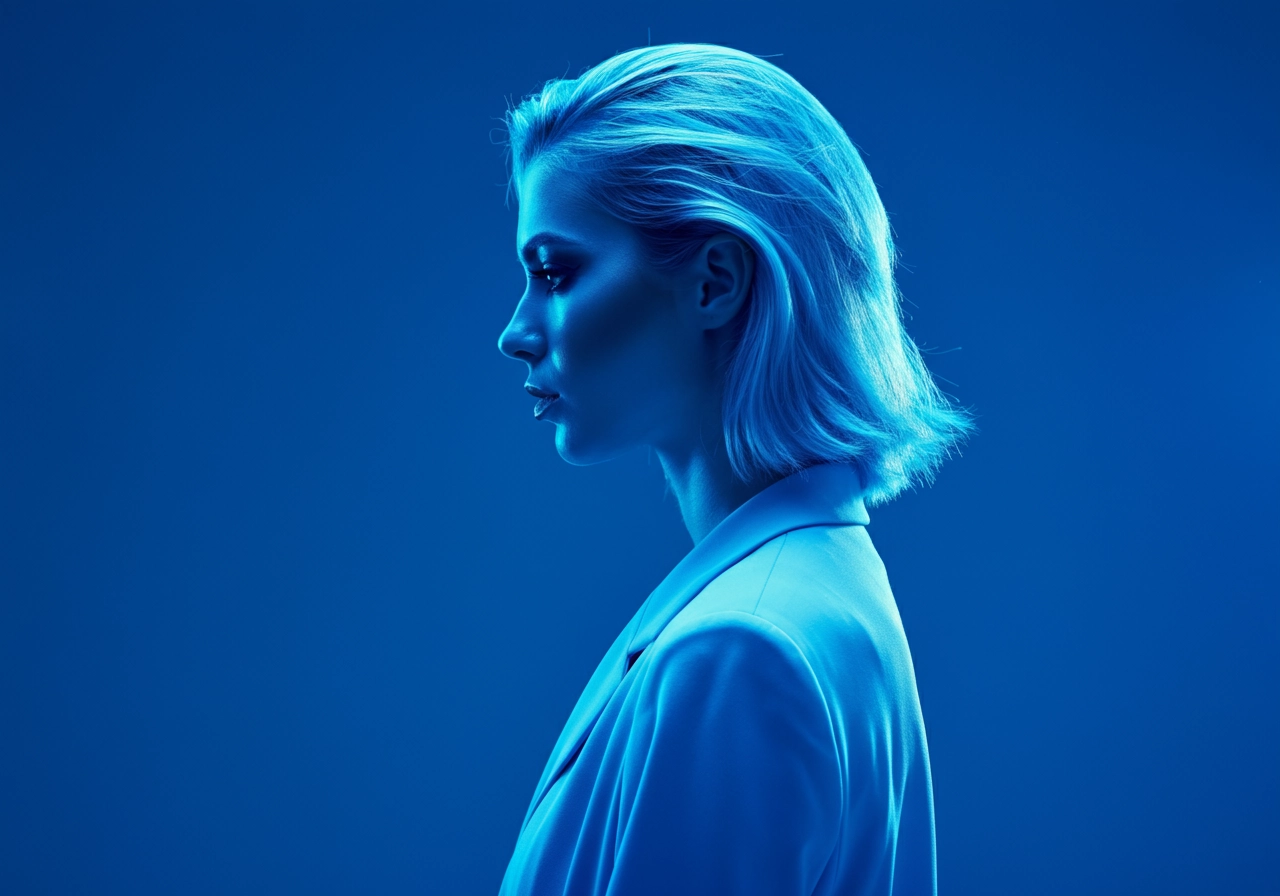The image shows a woman with a futuristic and minimalist style. The woman is surrounded by a strong blue contour light. The lighting in the scene is strongly dominated by shades of vibrant blue. The background is completely blue, creating a monochromatic effect. The pose is in profile, conveying an air of confidence and modernity.