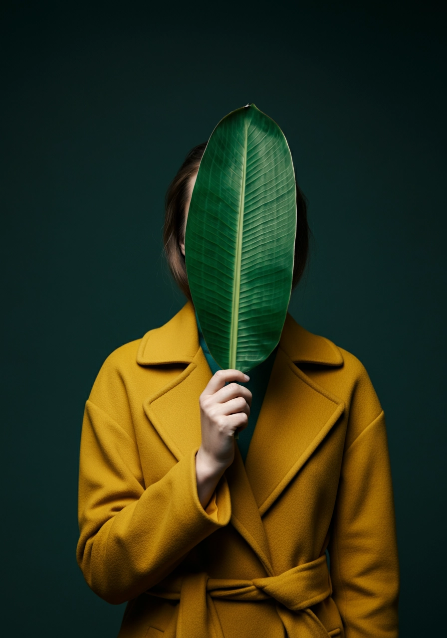 Female model using a fashion yellow coat with the collar up, with a green natural big banana leaf covering her eyes dramatically, the background is a flat 13B0C3 color without gradients or shadows
