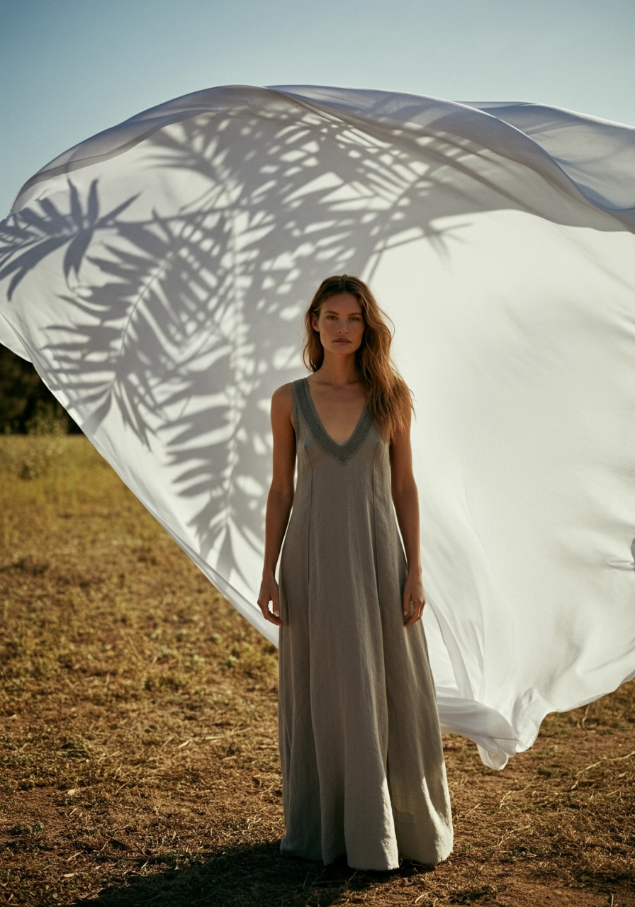 A woman is standing in front of a large flying fabric in soft white with shadows of the leaves creating a dynamic, abstract backdrop. She wears a stylish sleeveless dress with a modern cut inspired by the brand Free People. The dress showcases a variation with a deeper V neckline and slightly fuller boobs, adding to her sensual allure. Her hair flows gently with a calm, neutral expression. The setting is an earthy field with muted tones and soft, diffused lighting contributing to an avant-garde atmosphere. The composition is centered and symmetric, focusing on the contrast between the model and the fluid background, evoking a sense of modern elegance, sensuality, and artistic expression.